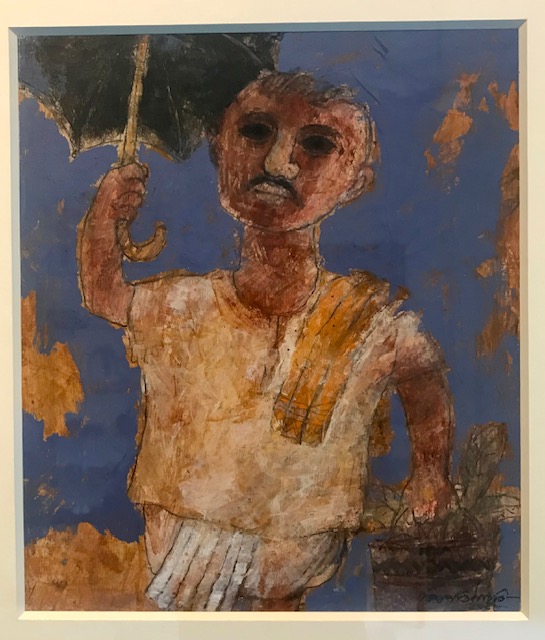 This small painting by a Kolkata artist named Biswapati Maity makes me happy every time I look at it on our living room wall. I spotted it in the online catalogue of a Chennai art gallery. When it arrived, it pleased me no end. I love the look on the man’s face, his thinning hair and moustache, his umbrella and shopping basket. If he had round glasses, it would be me.