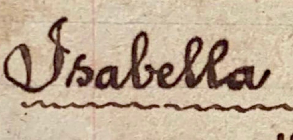 He does not describe anything. He does not say if his bride looked pretty that Wednesday morning, or tell what she wore, or what he felt as this girl became his wife. But his rendering of her name is to me a piece of art. Of everything on this page, I am drawn most to his Isabella.