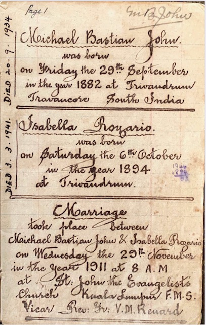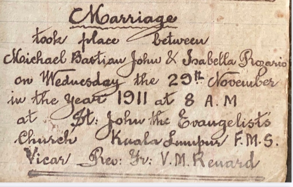 Marriage took place between Michael Bastian John & Isabella Rozario on Wednesday the 29th November in the year 1911 at 8am at St John the Evangelist’s Church, Kuala Lumpur, FMS. Vicar Rev. Fr. V.M. Renard