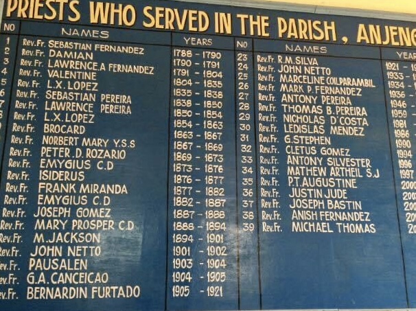 She also sends me a photo from a visit she made to Anjengo, where so many of her people came from. It shows a plaque at St Peter’s Forane Church, listing the parish priests going all the way back to 1788.