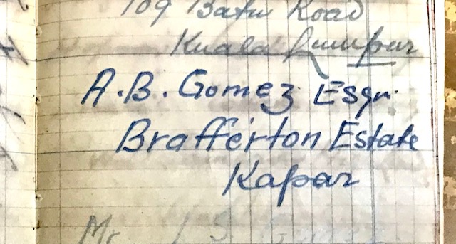 In Singapore, my friend Mary Magdalene Pereira spots her father’s first cousin, “S.J. Pereira” in Port Dickson, and tells me the initials stand for Stanley John. And “J.F. Gomez” in Kuala Selangor is her mother’s first cousin, Joseph Francis Gomez.