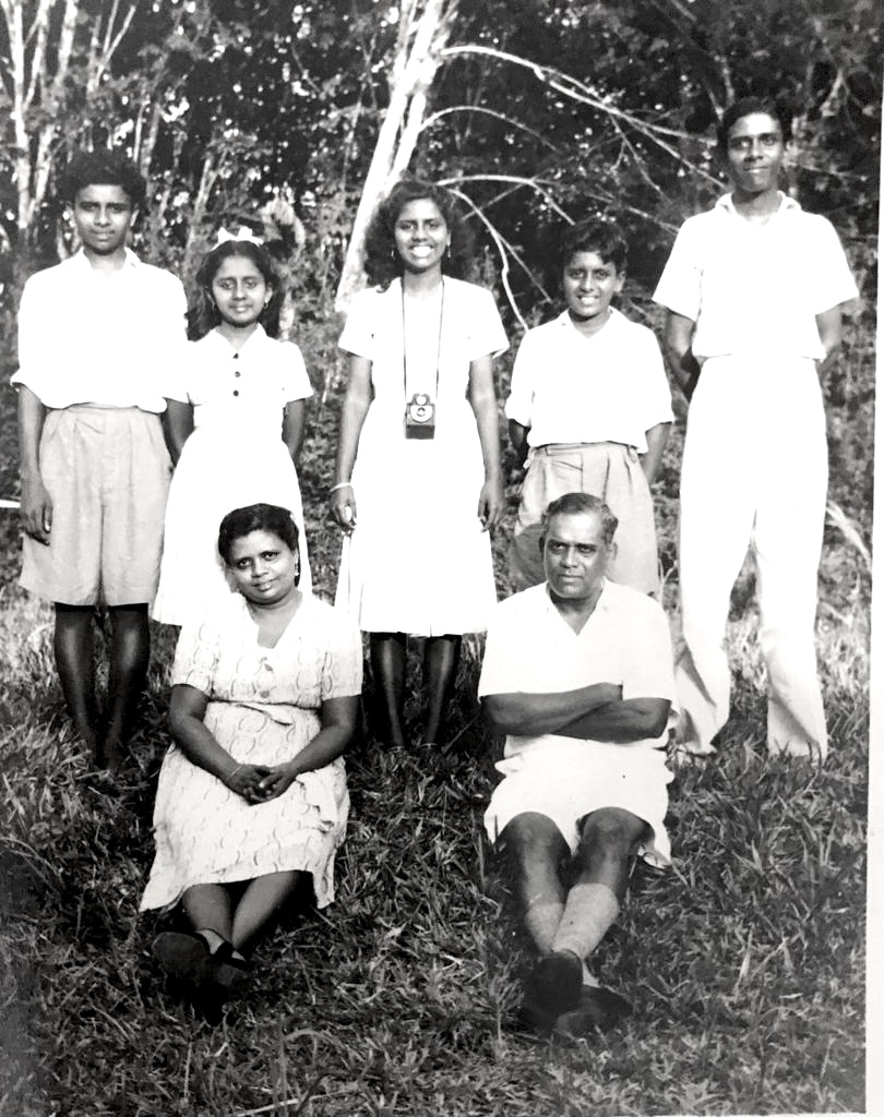 R.C. Lopez, known as Sunny Achen in the family, with his wife Elizabeth (Aley) and their children at their Sungei Way Estate home. Standing from left: Philip, Mary Magdalene, Theresa, Chrisanthus and Andrew. Photo courtesy of Andrew Lopez.