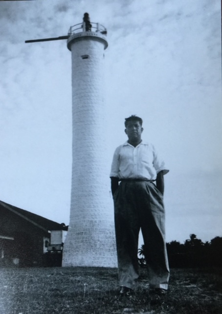 One, in particular, fascinated me for the longest time. It shows my father standing in front of a brick lighthouse, unsmiling, his hair blown by the breeze, his hands in the pockets of his baggy cotton trousers.