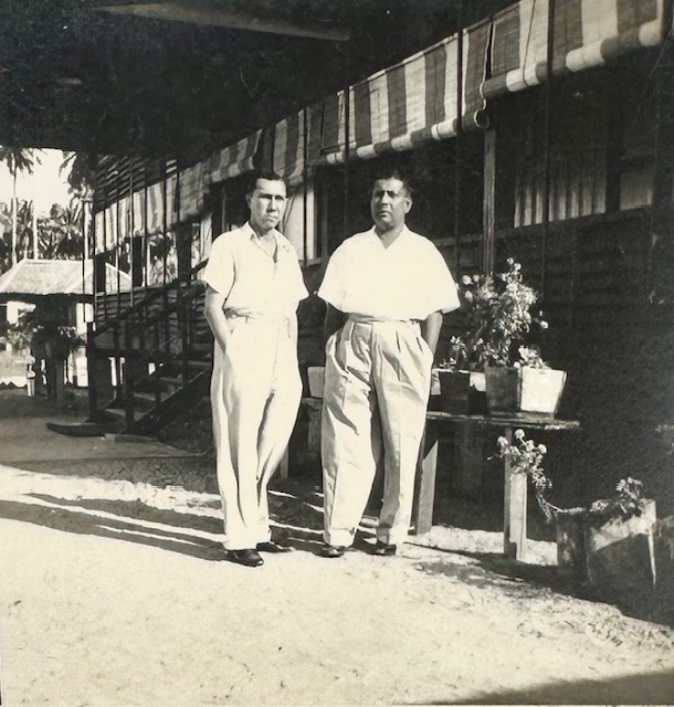 There are also shots in a park and at the seaside, with Kelantanese fishermen in the background. My father wears a grin in only one picture, where he and his friend Henry stand facing each other in front of some palm trees. The hand-written caption on the back says: “A chin-wag in the garden of the Railway Rest House – Tumpat.” It is dated Feb 19, 1952.