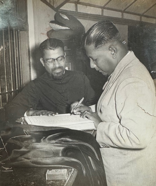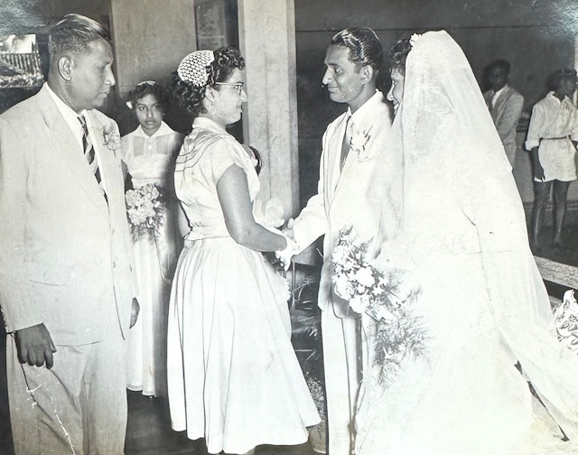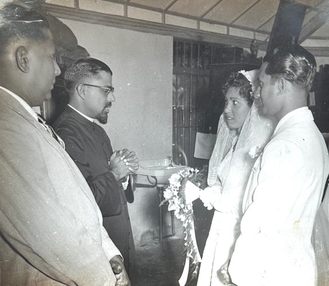 The last photographs of my father are at the wedding of my mother’s brother Teddy John, who married a teacher, Evelyn Lingam. My parents were the witnesses at the marriage, which was consecrated by Catholic priest Noel Clement on November 14, 1955.